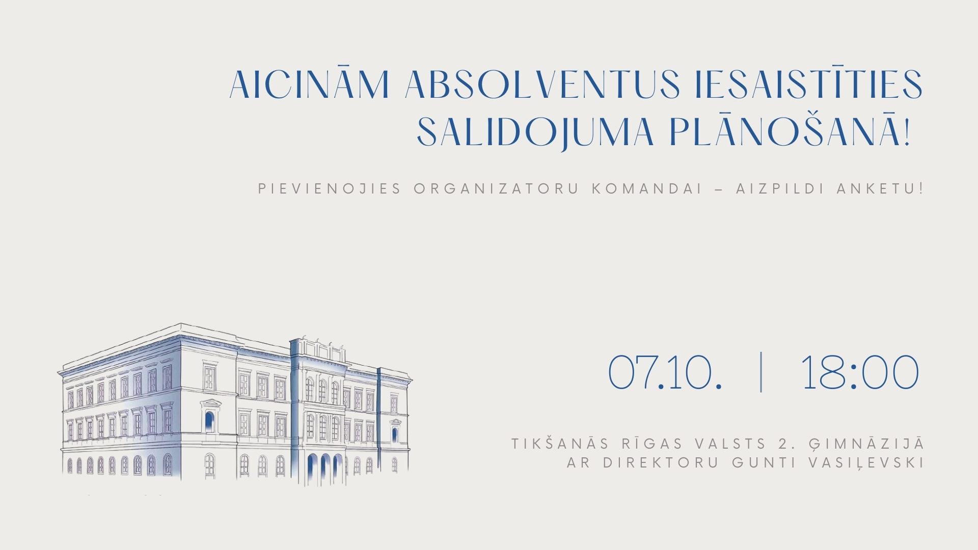 Šajā mācību gadā Rīgas Valsts 2. ģimnāzijai apritēs 110. gadi, par godu šim notikumam 2026. gada pavasarī svinēsim skolas salidojumu.