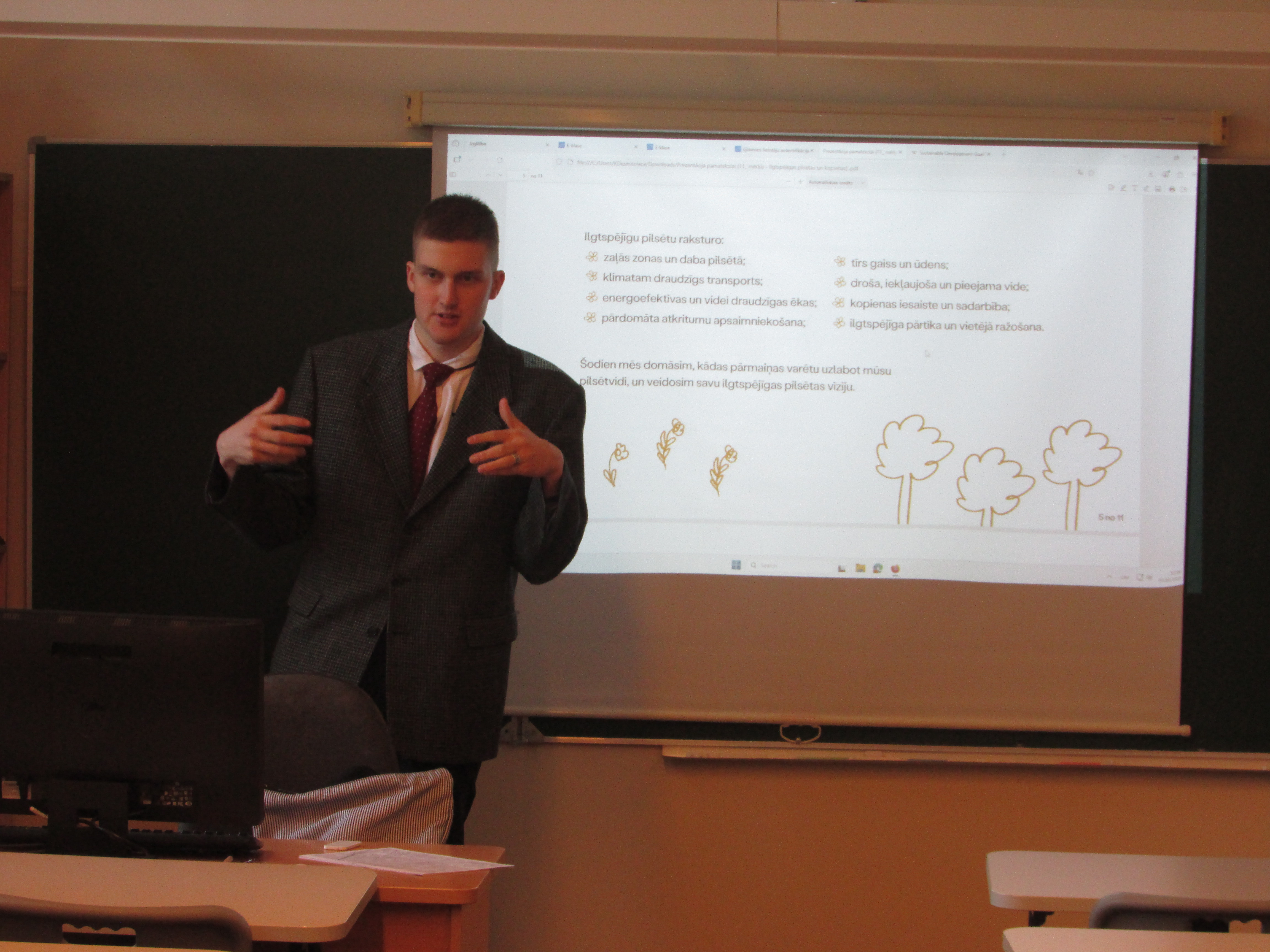 Stundā skolēni iepazina ANO Ilgtspējīgas attīstības 11. mērķi «Ilgtspējīgas pilsētas un kopienas», uzzināja, kas raksturo ilgtspējīgu pilsētu (zaļās zonas, klimatam draudzīgs transports, energoefektīvas ēkas, pārdomāta atkritumu apsaimniekošana, tīrs gaiss un ūdens, droša vide, kopienas iesaiste, ilgtspējīga pārtika un vietējā ražošana), un apskatīja dažādus piemērus, kā pilsētas laika gaitā mainījušās.