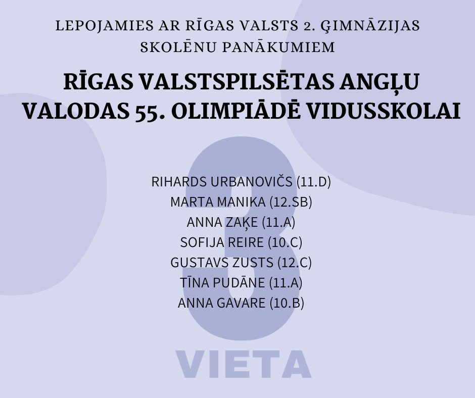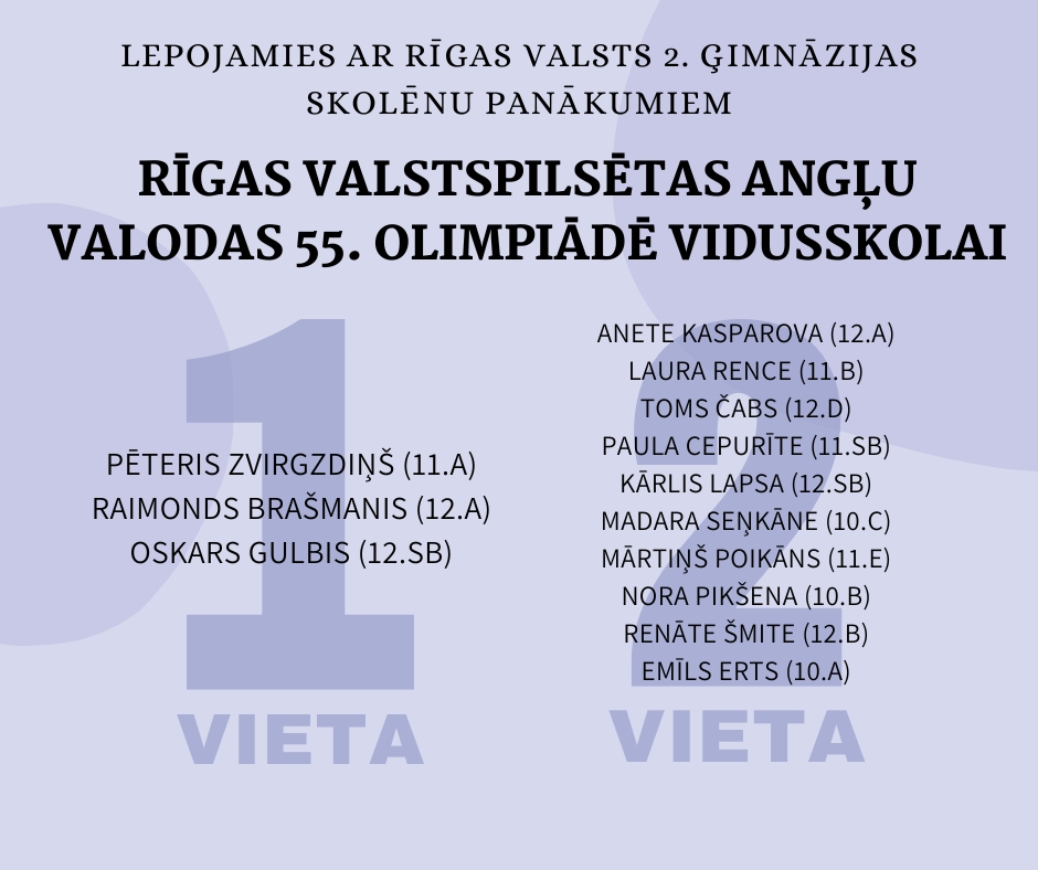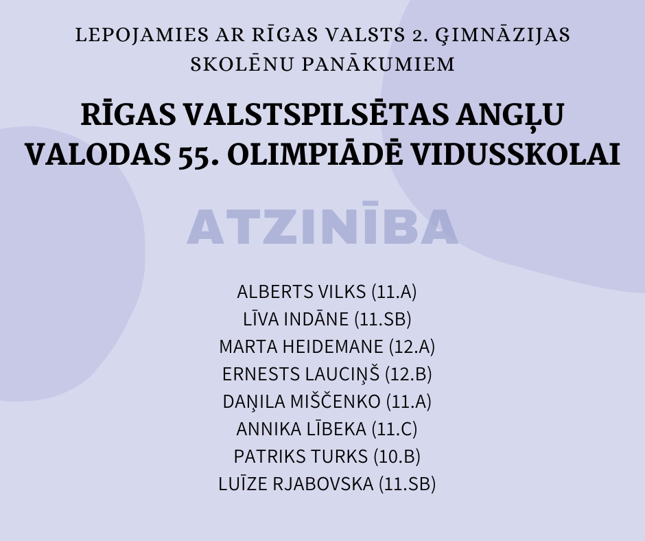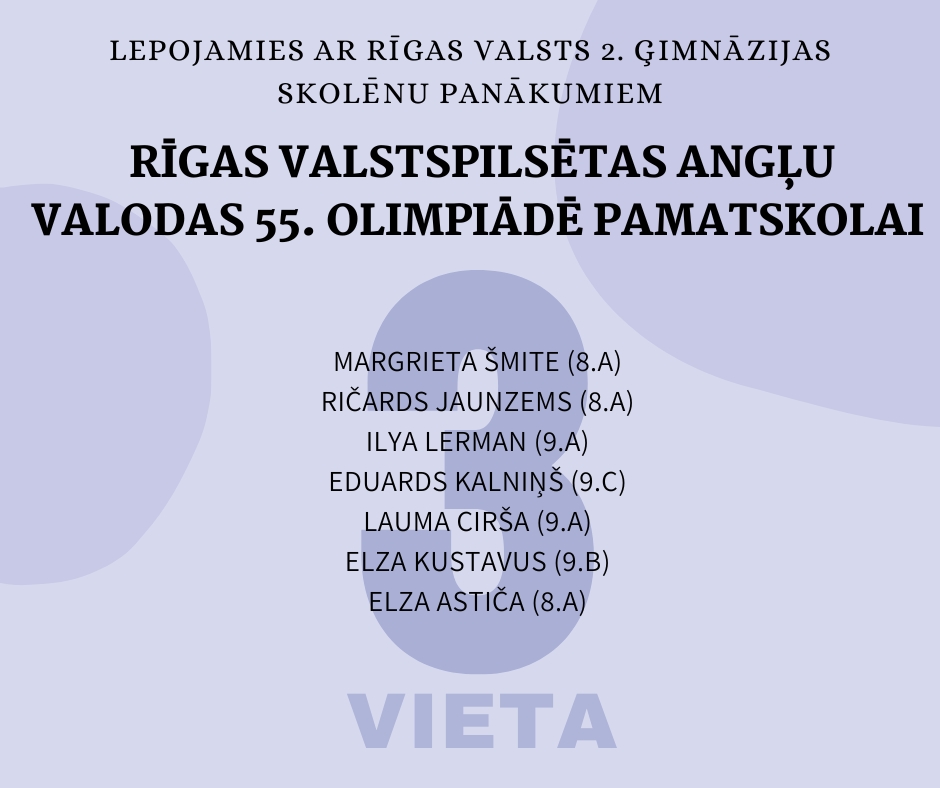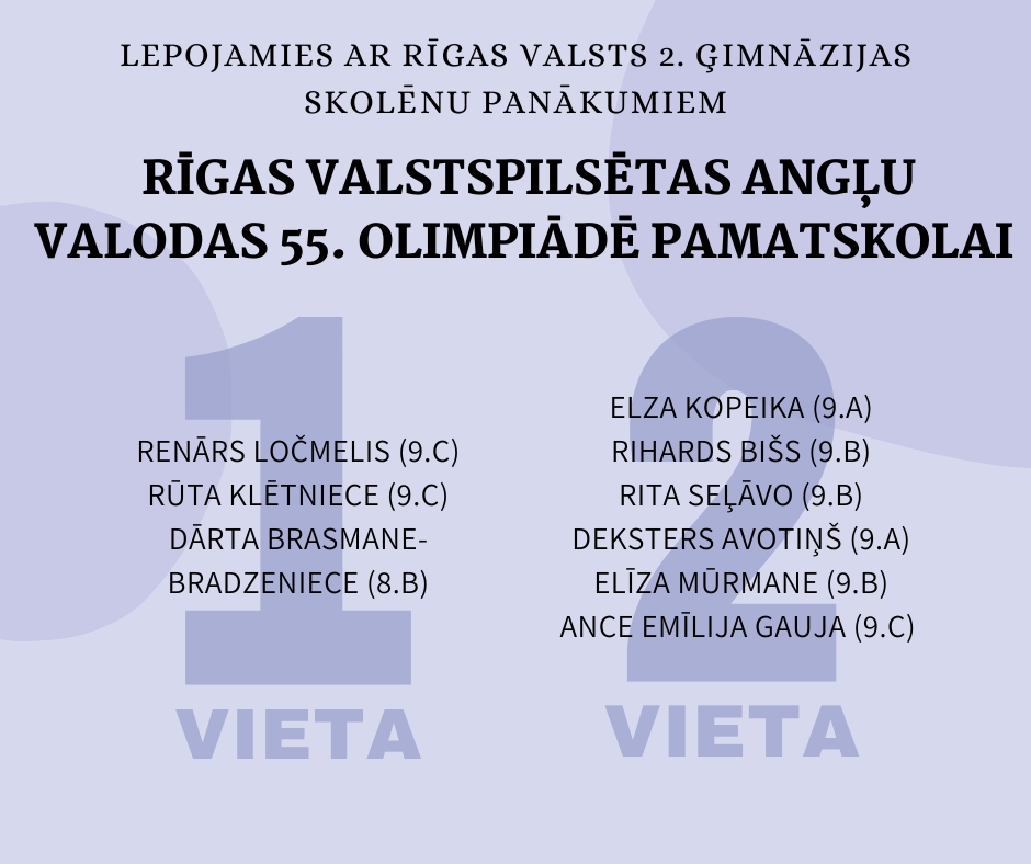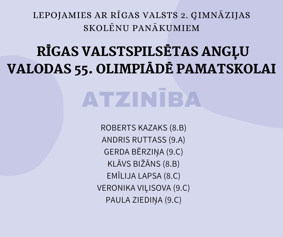 Olimpiādes pilsētas posmā no mūsu skolas kopā piedalījās 35 pamatskolas skolēni un 33 vidusskolas skolēni. Godalgota lielākā daļa šo skolēnu, par ko esam patiesi priecīgi un lepni!